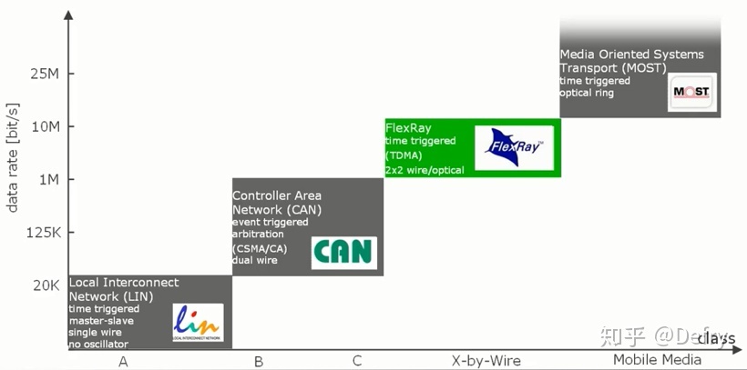线控技术提高了主动安全等现代化汽车电子的可能性。对信息的实时性和安全性有很高的要求。但当考虑线控应用场景和更高的带宽要求时,can fd无法满足要求,而flexRay则非常适用,但flexRay的应用对OEM的能力要求相比can会提高更多.flexRay可以实现10M/s的通讯速度。