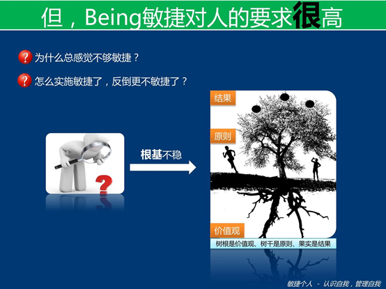 你的团队可能已经开始敏捷开发了,实施之后觉得没什么变化,或者可能变得更糟。我们知道敏捷宣言、敏捷原则和价值观,但是知道和做到是有很大区别的。而要做到之前,我们不仅需要知道,而是需要从意识层面去认识并认可这些深层次的东西,这无异于是一场个人的变革,因为我们需要重新认识自己、认识团队,认识早已习惯的环境。
