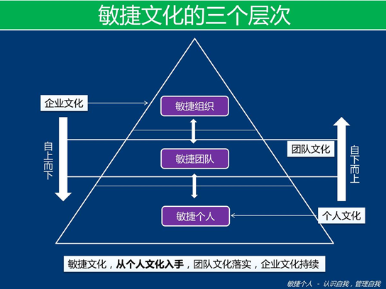 如果我们把敏捷个人作为一种文化,那么我把它叫做个人文化,也代表着敏捷个人更多的是一个个人成长的代名词。一个公司想要敏捷,我认为需要从图中的三个层次去共同推进。企业文化作用于敏捷组织,精益可以作为一个指导思想;团队文化可以作用于敏捷团队,Scrum和XP可以作为方法;而个人文化作用于个人,敏捷个人可以作为一个很好的框架来帮助个人的成长,进而自下而上的来促进敏捷文化的形成。