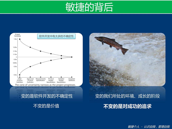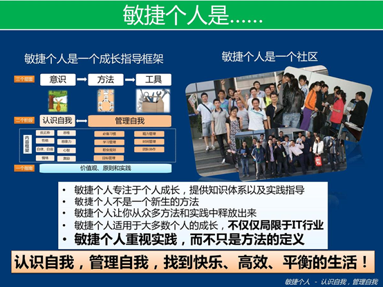 我们很多人并不真正的认识自己以及团队,这势必会造成不能很好的发挥自己的能力以及促进团队的成功。为了帮助别人,我首先必须让自己先敏捷起来,所以在Scrum过程中不断的对人的思考和实践,我逐步提出了"敏捷个人"这个新概念。
