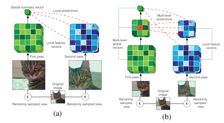 我的理解是在DeepInfoMAX的基础上加了一个multi-scale,即不同尺度上的feature也可以组成正负pair。