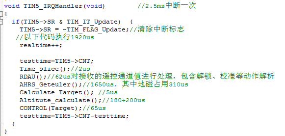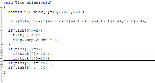 将整个飞控代码分成了几个周期分别为5ms,10ms,25ms、50ms和100ms的任务。而每个任务的时间标志flag是由一个时间片函数进行管理的。设了一个tick节拍,2.5ms一次,所以比如计数达到2次,则5ms的定时任务即可执行。