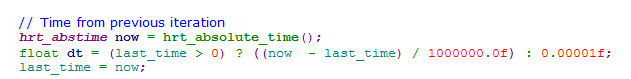 在飞控算法中,需要用到更新周期这个变量,当然,如果算法运行是固定周期,则变量的值就是所设定的周期,还可以代码自行测量,如下所示。