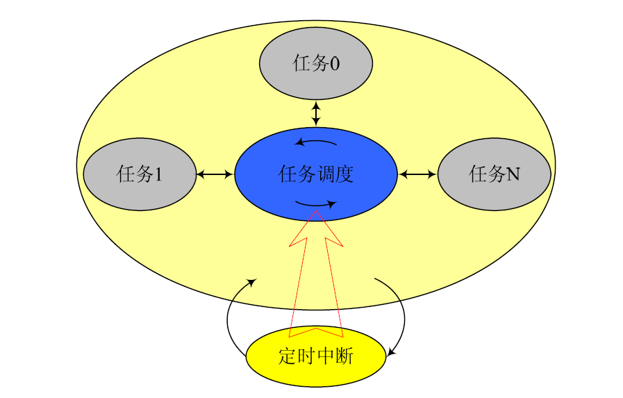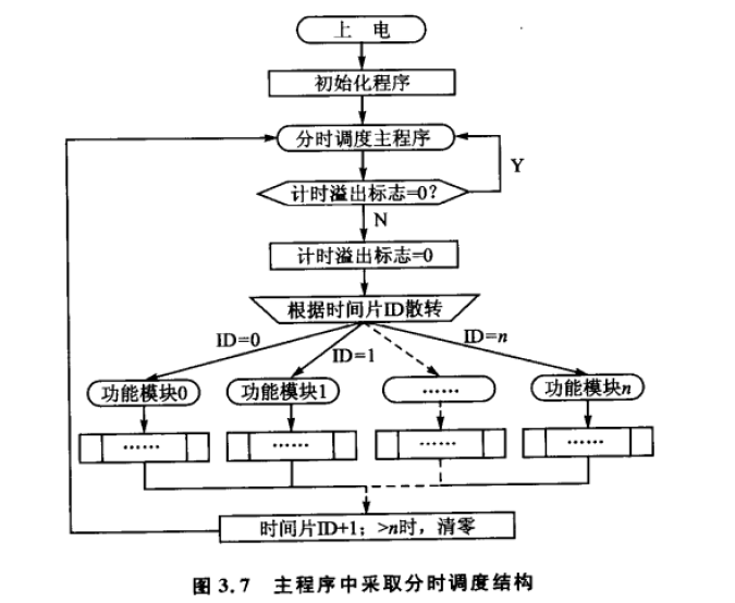 这种程序设计方法如下图所示。定时中断的影响只在任务调度模块里起作用,依次让不同的任务按不同的周期进行执行。要注意的是所设计的每个任务运行时间不能超过设定的周期。