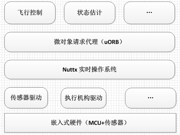 - 中间层: 通讯的中间层运行于操作系统之上,提供设备驱动和一个微对象请求代理(micro object request broker ,uORB)用于飞控上运行的单个任务之间的异步通信。