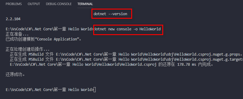菜单栏->Terminal->New Terminal,在新打开的终端中输入dotnet --version(查看版本),dotnet new console -o HelloWorld