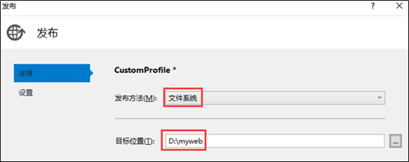 继续选择“文件系统”,目标位置选择一个提前创建好的空文件夹myweb用来保存发布的项目文件。然后继续“下一步”。