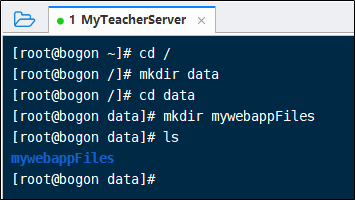 打开成功后,输入下面的命令,我们创建data和mywebappFiles文件夹,用来接收上传的项目文件。