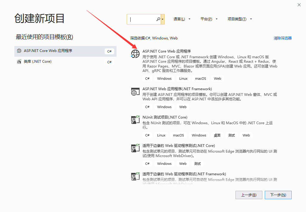 2)选择ASP.NET Core Web 应用程序,点击下一步