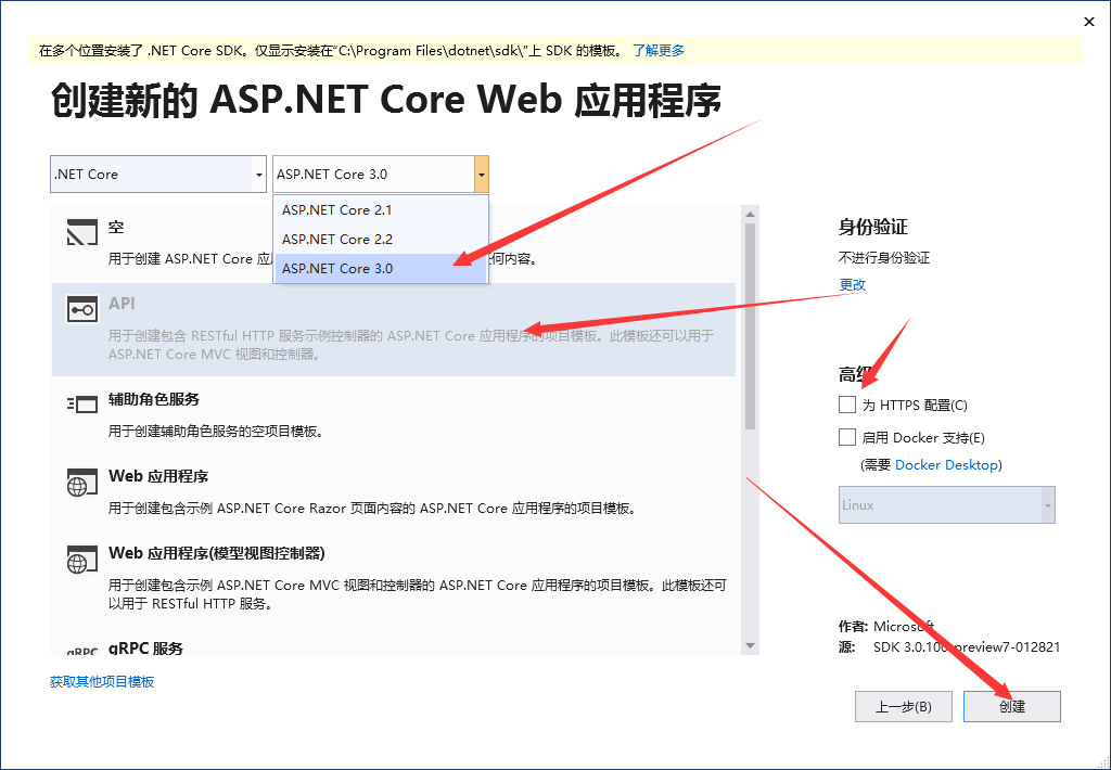 4) 选择ASP.NET Core 3.0,因为我要建的是WebApi项目,所以我选择了API,暂时不启用Https,最后点击创建,大功告成。
