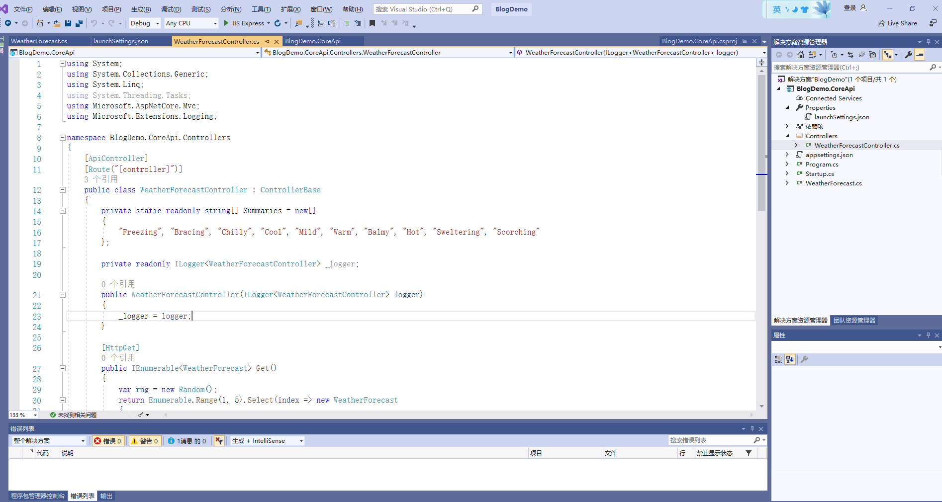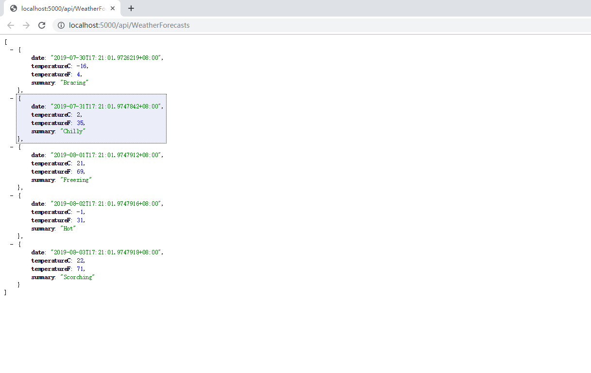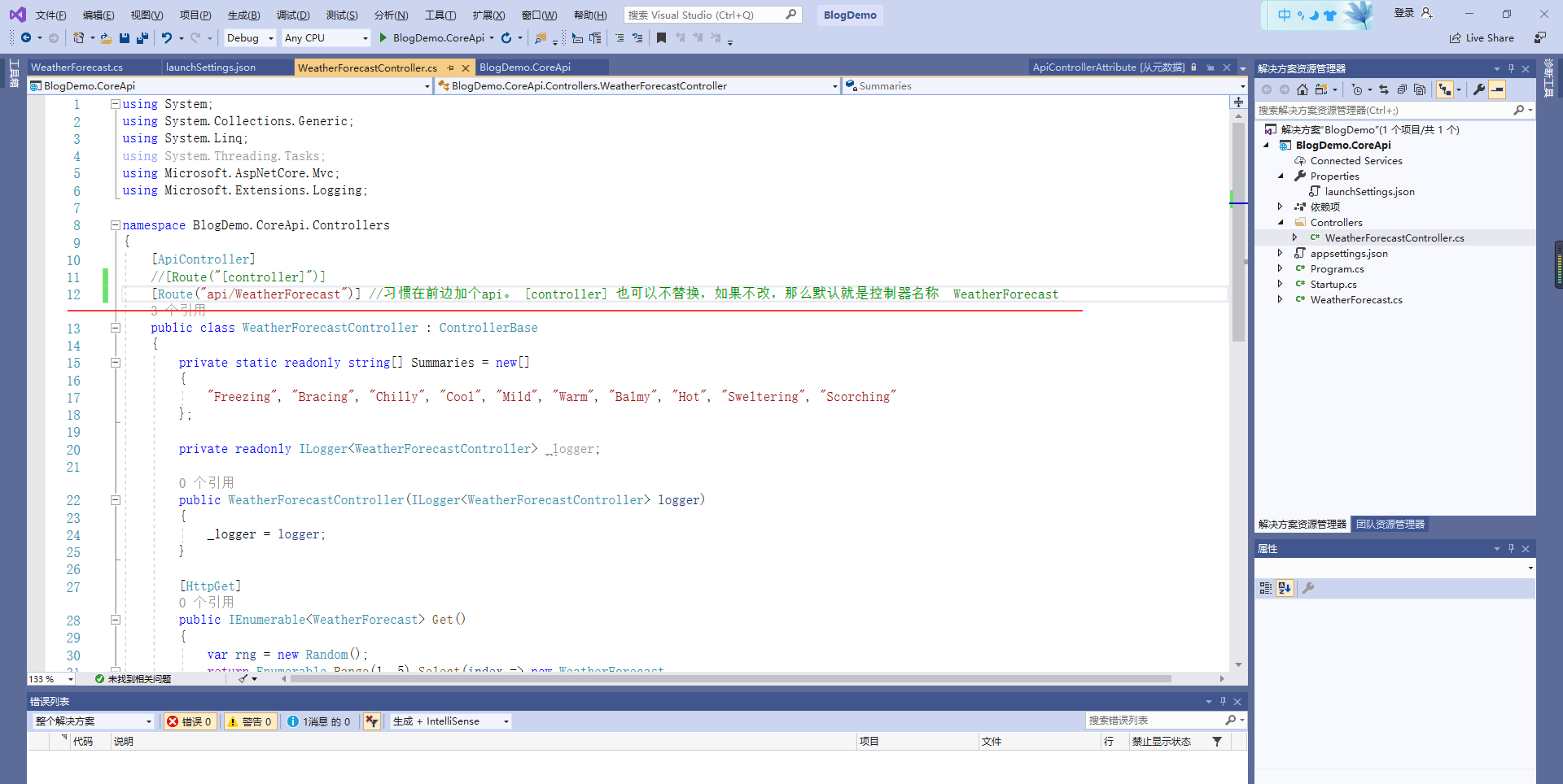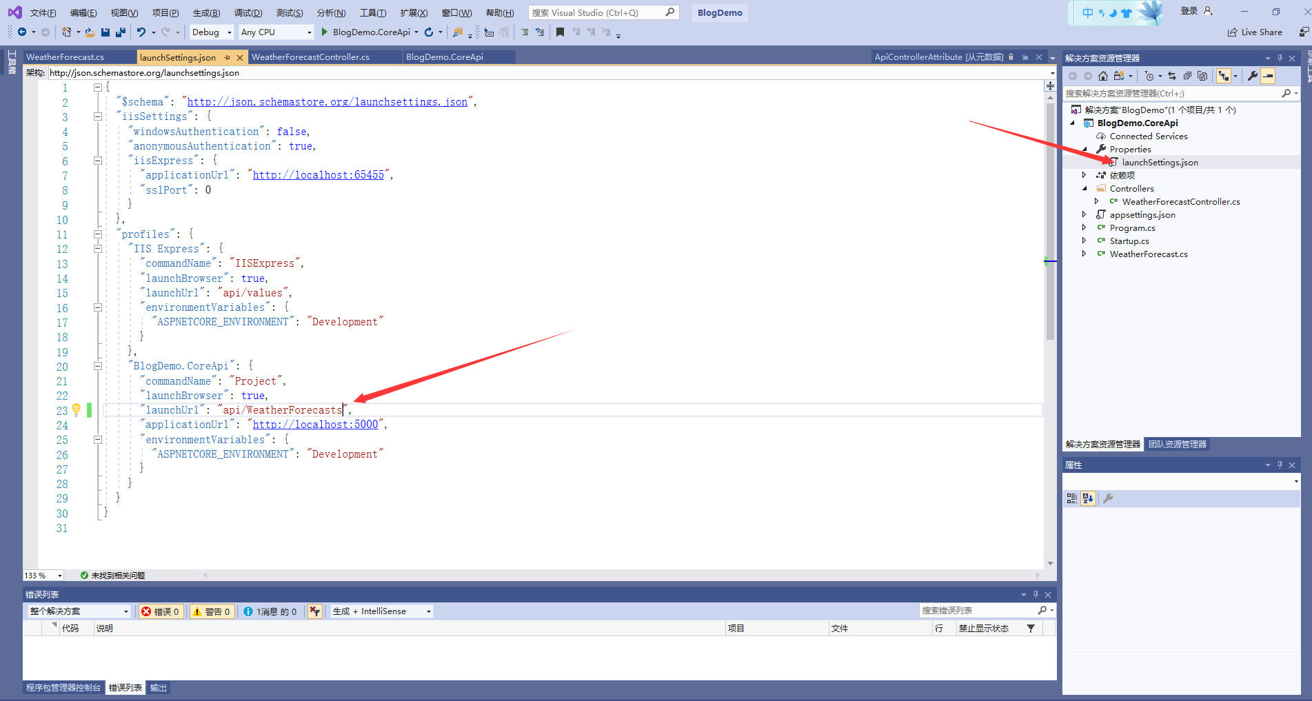 3 将该项目运行起来,从launchSettings.json文件中,我们可以看到它默认打开的是 api/values,以前的版本会默认生成一个ValuesController,链接没问题,但现在这个版本默认生成的是WeatherForecastController,所以要做一些改变。