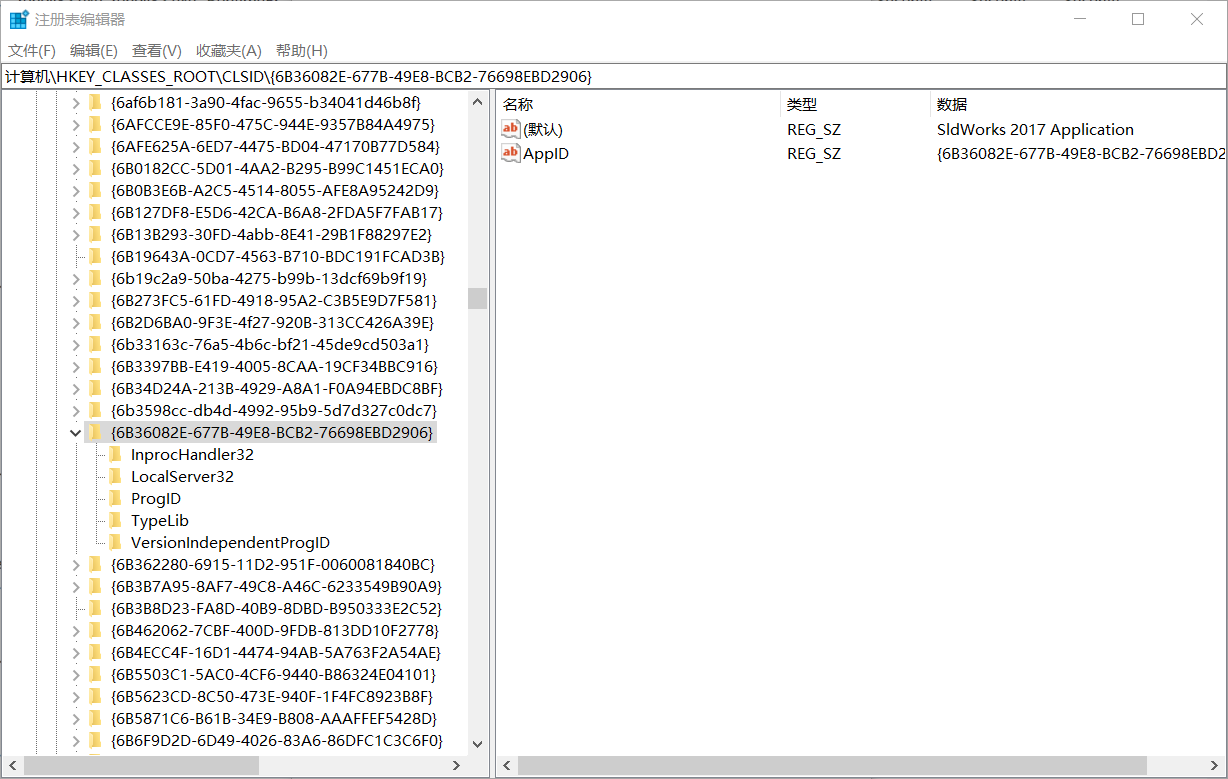 通过注册表中,我们可以看到,该CLSID号对应的是SolidWorks应用程序。由此我们可以得出,错误的本质原因是在本地通过网页调取服务器里面已经存在的SolidWorks2017失败了,也就是无法启动服务器里的SolidWorks2017。