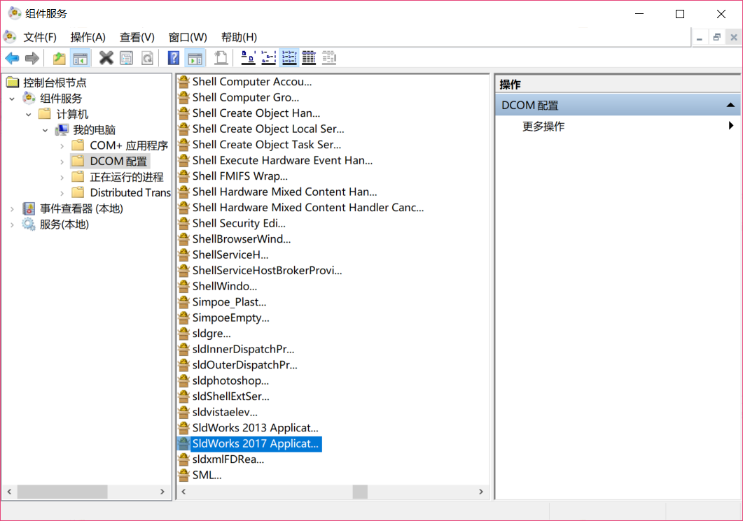 接着我们打开服务器组件服务,在里面找到在“组件服务/计算机/我的电脑/DCOM配置”,在里面找到SolidWorks2017软件,