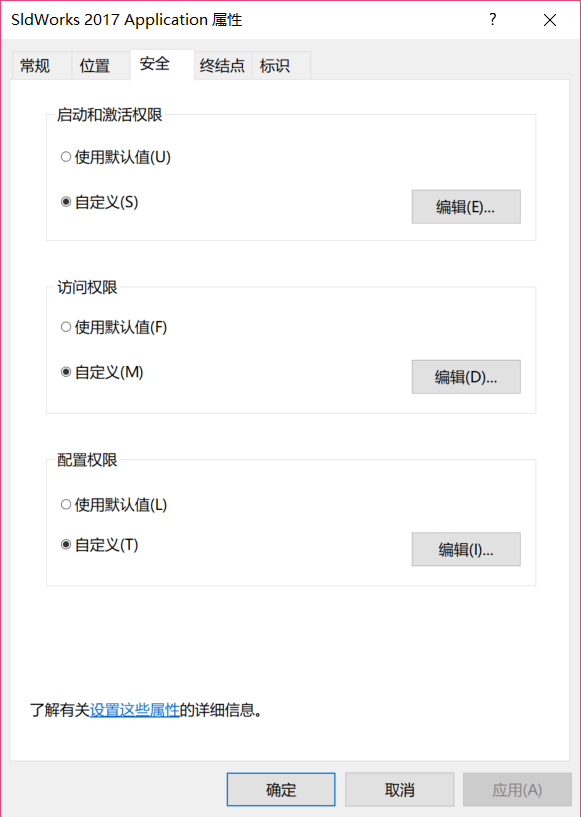 选中SldWorks2017,然后右击,选择属性,弹出如下对话框,在安全选项卡里面,由默认设置改为自定义,然后再自定义里面添添加用户,并设置权限,主要是设置为可以远程启动和激活,远程可以访问。