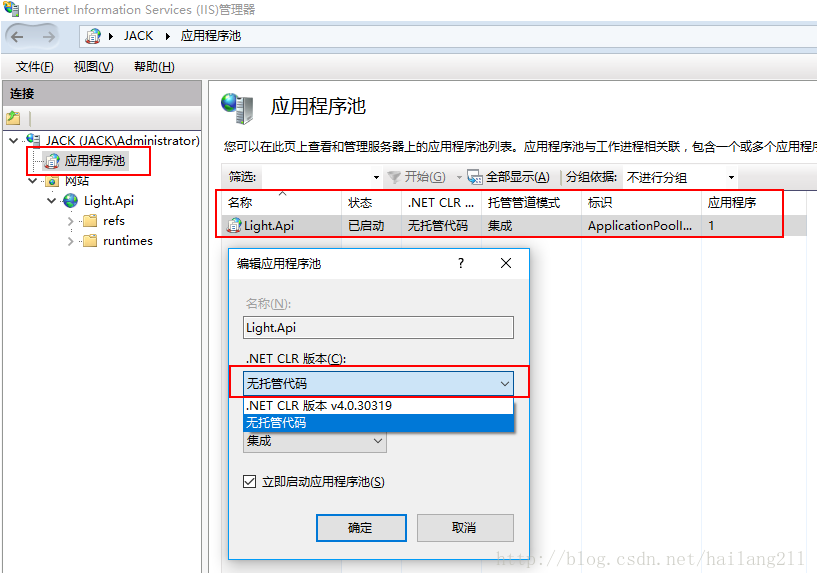 设置应用程序池的.NET CLR版本为“无托管代码”,因为刚才也说了,IIS是作为一个反向代理的角色,并不需要它来托管代码