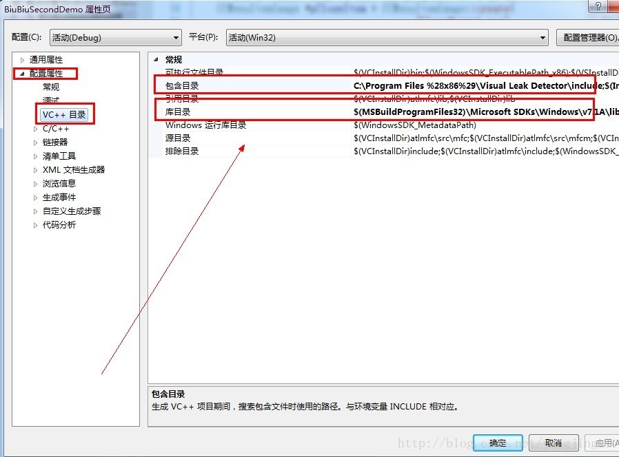 在我们的项目上右击——>属性——>配置属性——>VC ++ 目录——> 分别 在 包含目录 和 库目录 添加 vld安装目录的include和lib