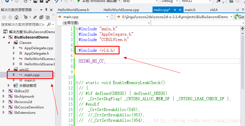 添加引用头 #include <vld.h> (添加是否成功,可以光标在 vld.h 上 shift+alt+G 进入,如果正常打开vld.h 说明配置正确)