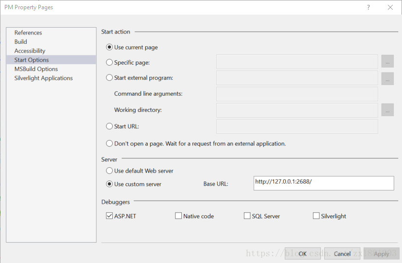 2.于是我在百度 搜索了半天,才知道需要在 VS 中 修改默认 Server (服务器)。在网上找了多教程,如何在VS 中调用 IIS 服务器 调试代码,试了整整一天啊,才发现网上的版本不适合我的 VS 2015 和 IIS 10.0 (VS 2010 版本的连接如下:)