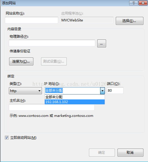 (3) IP地址选择你计算机的ip地址就可以了,端口号要选择不被占用的,这里就用80了,最后点确定