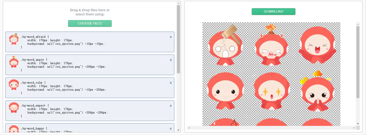 只需要将自己想要的图片上传上去,就可以生成右边的雪碧图了,下载图片,就可以引用了,可以直接复制坐标的css代码来引用图片。