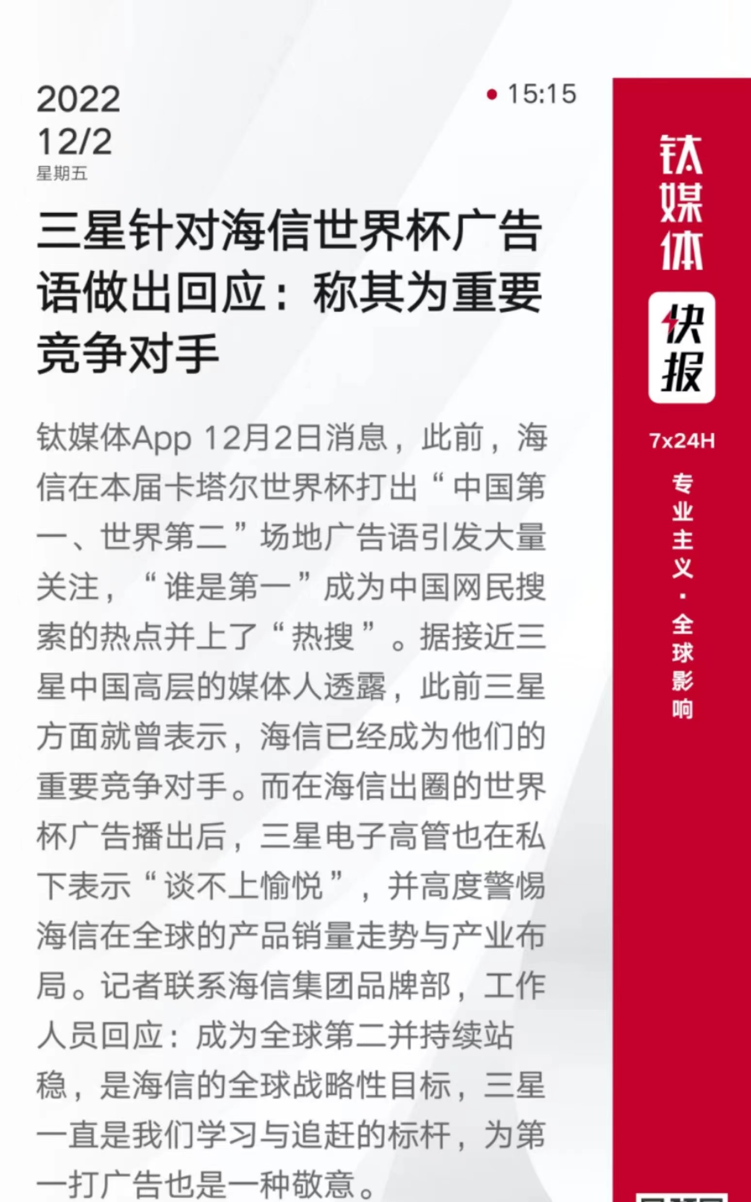 来自钛媒体App 12月2日消息,接近三星中国高层的媒体人透露,此前三星方面就曾表示,海信已经成为他们的重要竞争对手。而在海信出圈的世界杯广告播出后,三星电子高管也在私下表示“谈不上愉悦”,并高度警惕海信在全球的产品销量走势与产业布局。
