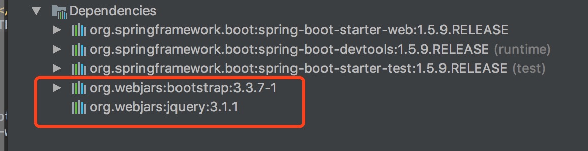 然后我们观察一下项目的依赖jar包,依赖中就有了bootstrap.jar和jquery.jar