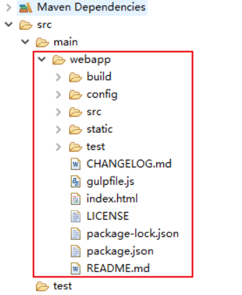 在src/main下建立一个webapp文件夹,然后将前端项目的源文件复制到该文件夹下,具体结构如图