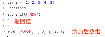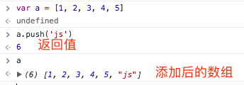 此方法可以将一个元素添加到数组结尾,并返回添加成功后数组的长度。比较简单,直接在控制台演示好了。