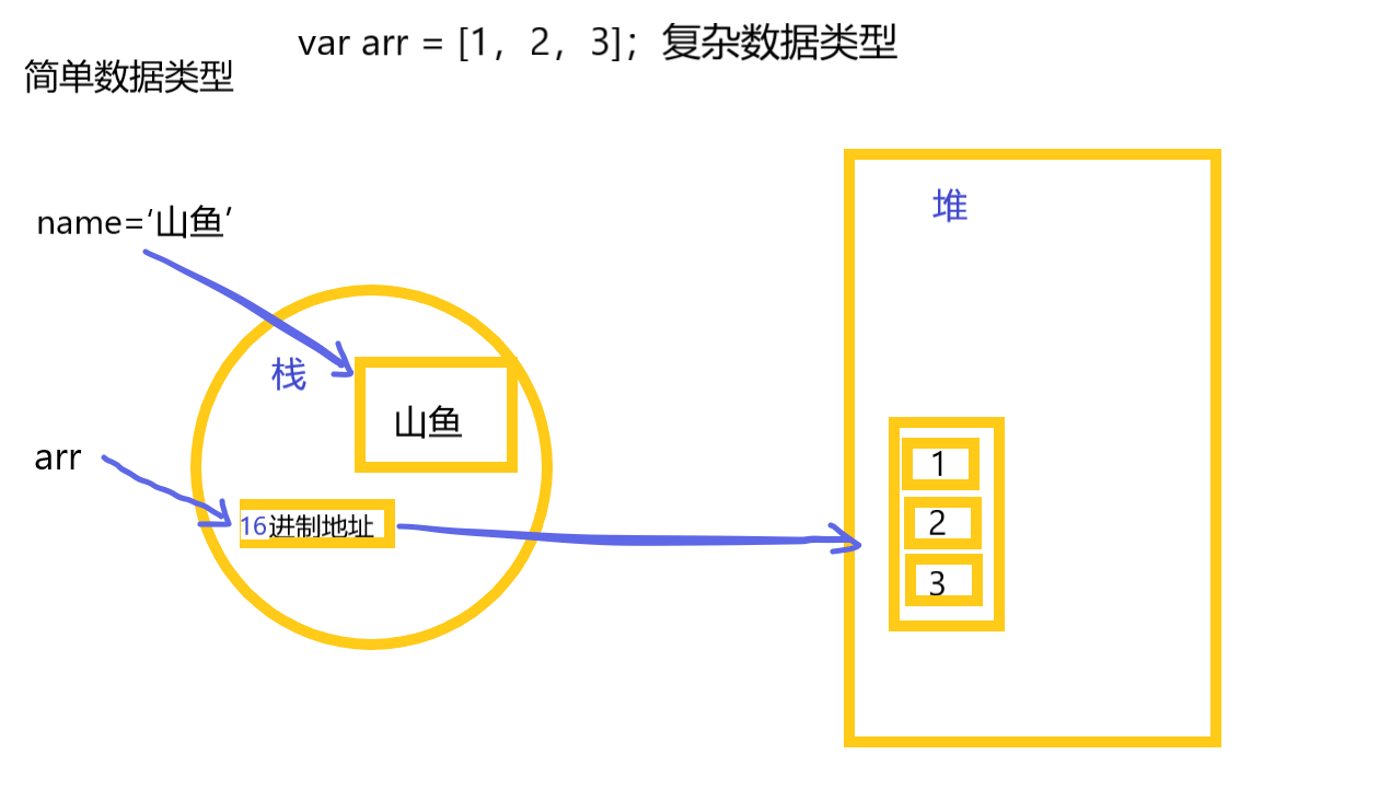 例如:var arr = [1,2,3] 先把arr指向栈,然后在里面存放的是arr的地址,而不是值,然后这个地址在指向堆,并且开辟出一个空间给这个地址所指向的值