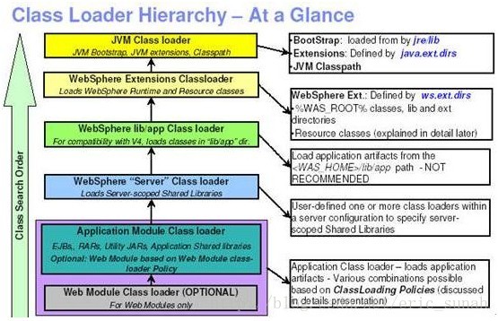 如上图所示,WebSphere 中类加载器被组织成一个自上而下的层次结构,最上层是系统的运行环境JVM ,最下层是具体的应用程序,上下层之间形成父子关系。