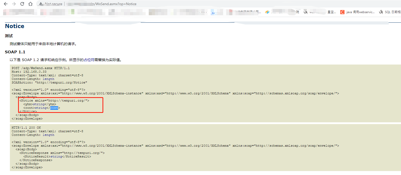 import org.apache.axis.client.Call; import org.apache.axis.client.Service; import javax.xml.namespace.QName; import javax.xml.rpc.ServiceException; import java.rmi.RemoteException; public class SoapWebService { /** * * @param yhm 员工编号 * @param cont 发送的模板内容 * @throws ServiceException * @throws RemoteException */ public static void sendMsg(String yhm,String cont) throws ServiceException, RemoteException { // webService链接地址 String url = "http://192.168.0.33/adp/WxSend.asmx"; // server域名地址,为了统一规范,一般都是这个域名 String soapaction = "http://tempuri.org/"; // 方法名 String methodName = "Notice"; // 用户提供测试的两个参数 // String yhm = "10000"; // String cont = "包"; // 以接口方提供测试数据为准,我这里为""是接口方要求 Service service = new Service(); Call call = (Call) service.createCall(); call.setTargetEndpointAddress(url); // 设置要调用哪个方法 call.setOperationName(new QName(soapaction,methodName)); // 设置要传递的参数名 call.addParameter(new QName(soapaction,"yhm"),org.apache.axis.encoding.XMLType.XSD_STRING, javax.xml.rpc.ParameterMode.IN); call.addParameter(new QName(soapaction,"cont"),org.apache.axis.encoding.XMLType.XSD_STRING, javax.xml.rpc.ParameterMode.IN); // 提供标准类型 call.setReturnType(org.apache.axis.encoding.XMLType.XSD_STRING); call.setUseSOAPAction(true); call.setSOAPActionURI(soapaction + methodName); // 调用方法并传递参数 String ref = (String)call.invoke(new Object[]{yhm,cont}); System.out.println(ref); } public static void main(String[] args) throws ServiceException, RemoteException { sendMsg("100000","hh"); } }