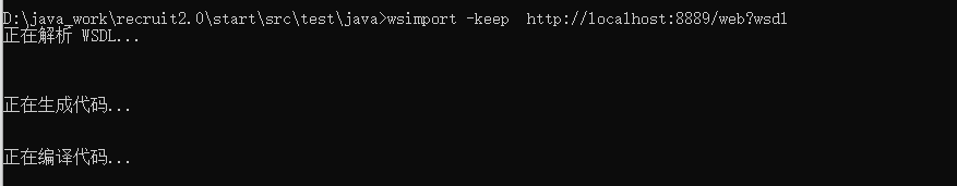 执行:打开命令行窗口,切换到项目的src目录,执行"wsimport -keep http://localhost:8889/web?wsdl"生成客户端代码,如下图所示