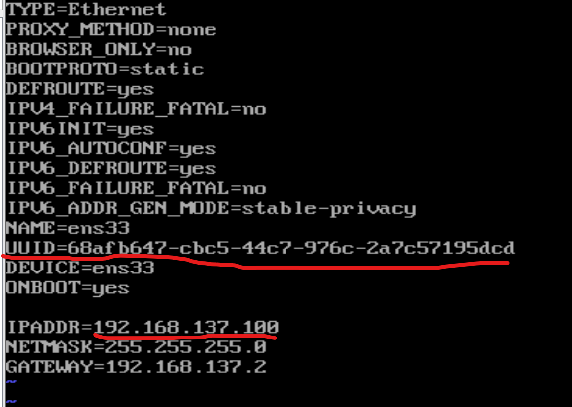 删除UUID (文章中说还需要删除MAC地址信息HWADDR,我的ifcfg-ens33中无此信息),并分别修改两台克隆机ip地址为192.168.137.101、192.168.137.102,保存退出,重启网络。(参考文章中提到需要删除/etc/udev/rules.d/70-persistent-net.rules,我的机器中没有这个文件,原因及文件作用暂不深究,发现一相关文章,马克一下:70-persistent-net.rules以及网卡配置详解)