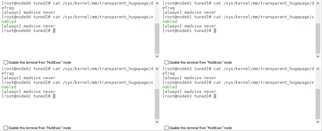 echo never > /sys/kernel/mm/transparent_hugepage/defrag echo never > /sys/kernel/mm/transparent_hugepage/enabled