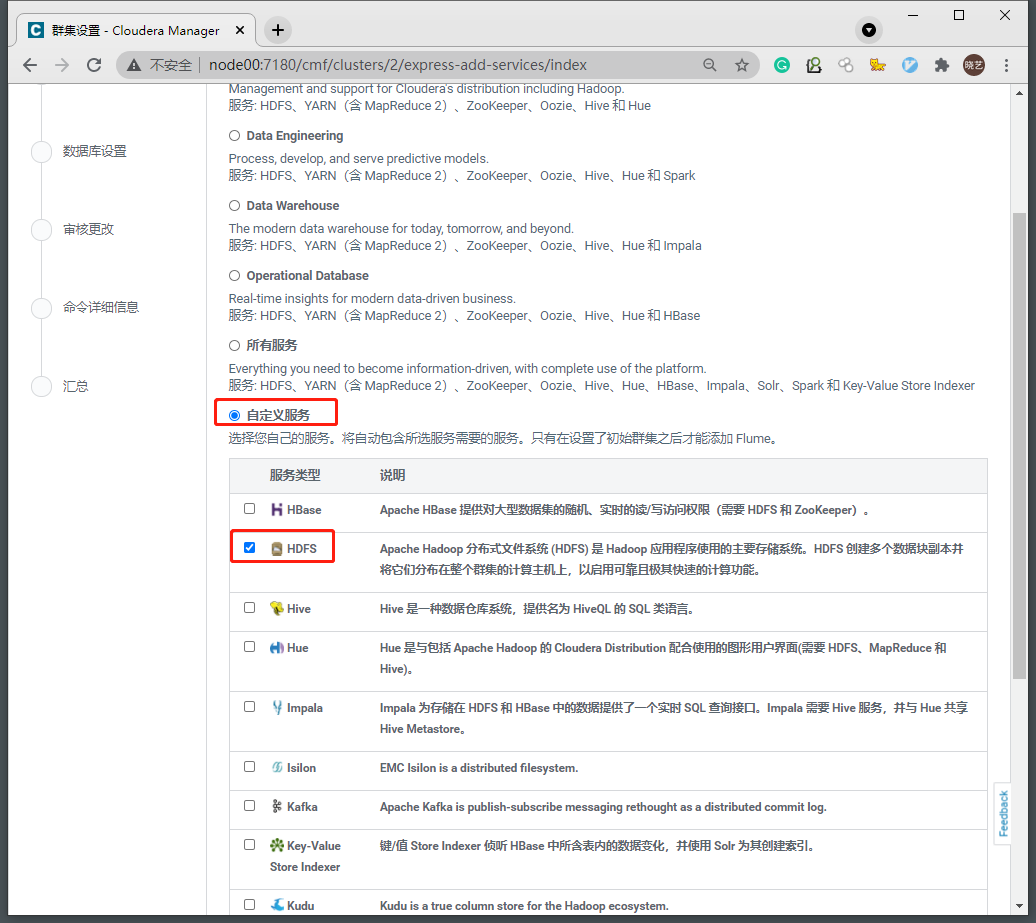 - 我们这里先自定义选择仅安装HDFS,继续