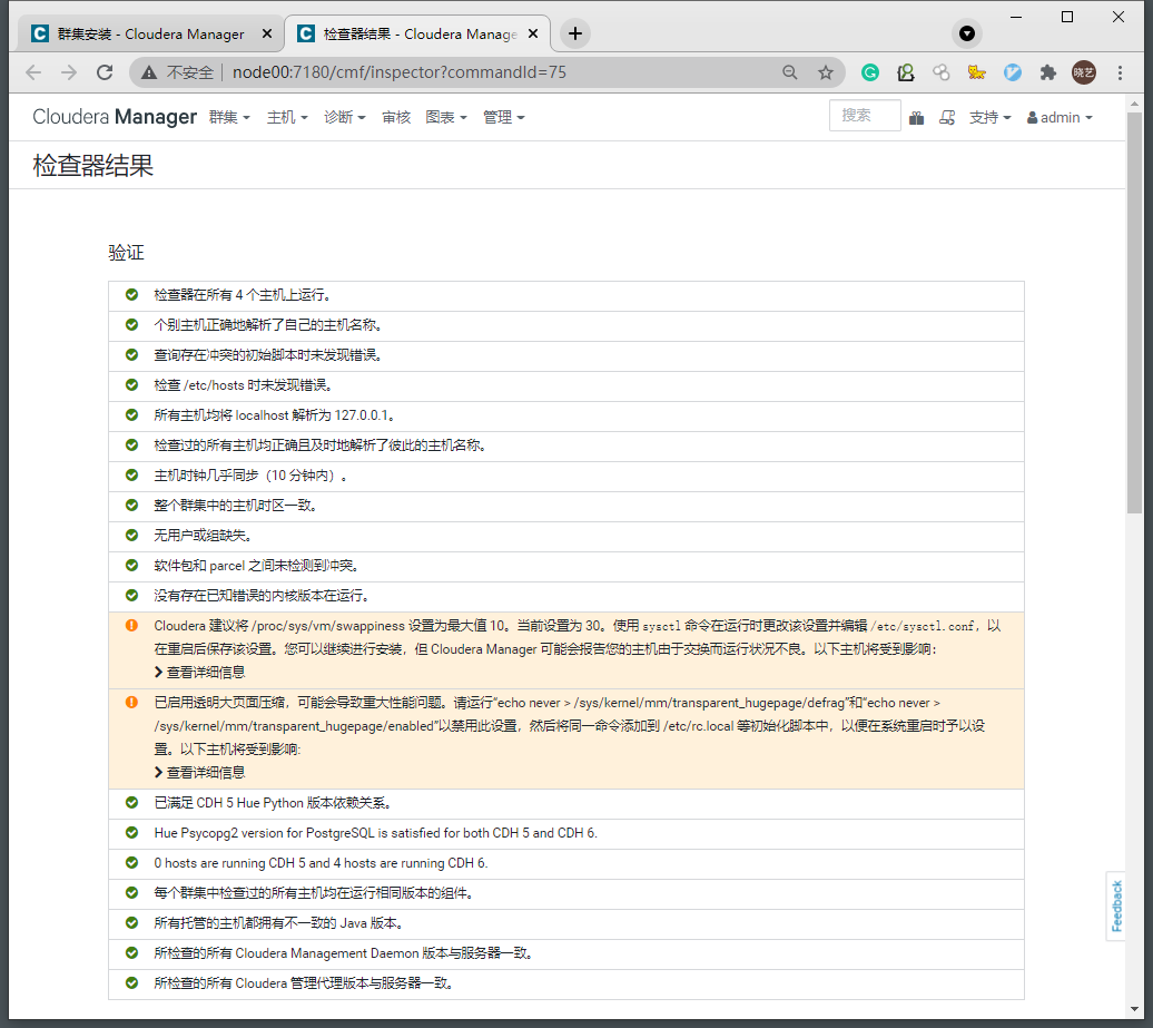 Cloudera 建议将 /proc/sys/vm/swappiness 设置为最大值 10。当前设置为 30。使用 sysctl 命令在运行时更改该设置并编辑 /etc/sysctl.conf,以在重启后保存该设置。您可以继续进行安装,但 Cloudera Manager 可能会报告您的主机由于交换而运行状况不良。以下主机将受到影响: -