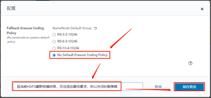 这里我们的集群无法满足最低的5台DataNode节点要求,所以可以选择关闭纠删策略