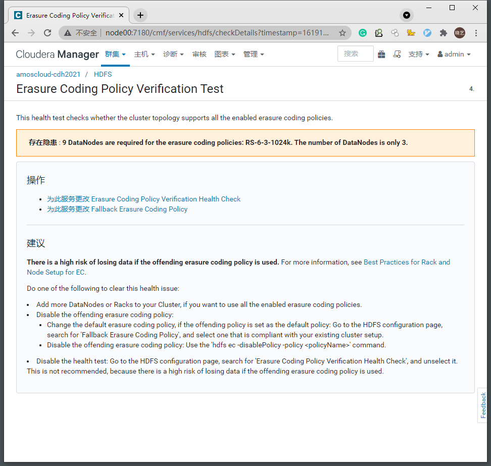 纠删码策略警告是由于当前的HDFS集群DataNode节点数不满足当前所配置的纠删码策略需要的最小主机数 -