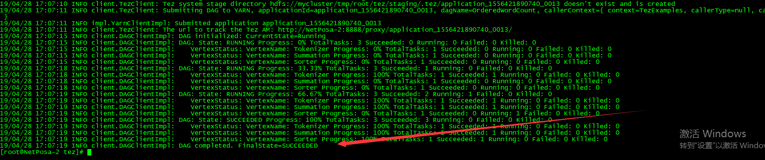 hadoop jar tez-examples-0.9.0.jar orderedwordcount /data/tez_input /user/ceshi/tez_output