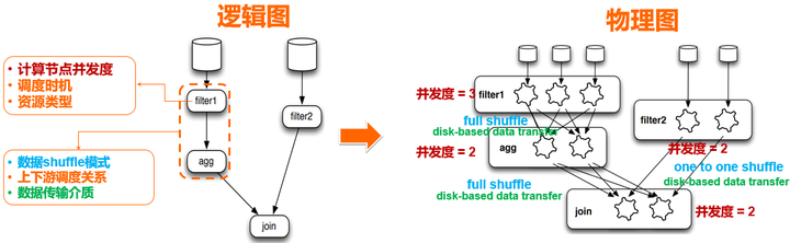 物理图更多描述了执行计划映射到物理分布式集群的具体描述,体现的是执行计划被物化到分布式系统上,具备的一些特性:比如并发度,数据传输方式等等。