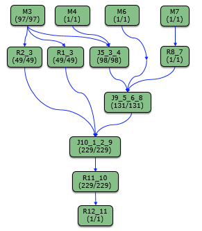 而实际上,对于这种计算pattern而言,M2需要读取(并进行处理)的,应该只有能和M1的输出join得上的数据,也就是说在考虑了整体执行cost后,在这种M1期望的输出数据要比M2小的多的情况下,可以先行调度M1完成计算,将M1输出数据的statistics在AM/DAG端进行聚合,然后只挑选出M2的有效数据进行处理。这里"M2的有效数据"的选择本质上是一个predicate push down的过程,可以由计算引擎的优化器和运行时联合进行判断。也就是说,这种情况下M2的并发度调整,是和上层计算紧密结合的。
