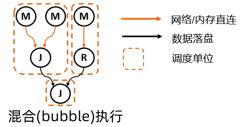 今天在线上,离线模式因为其on-demand的资源申请以及中间数据落盘等特点,作业在资源利用率,规模性和稳定性方面都有明显的优势。而准实时模式则通过常驻的计算资源池以及gang scheduling这种greedy资源申请,降低了作业运行过程中的overhead,并使得数据的pipelined传输处理成为可能,达到加速作业运行的效果,但其资源使用的特点,也使其无法在广泛范围内来支持大规模作业。DAG 2.0的升级,不仅在同一套架构上统一了这两种计算模式,更重要的是这种统一的描述方式,使得探索离线作业高资源利用率,以及准实时作业的高性能之间的tradeoff成为可能:当调度单位可以自由调整,就可以实现一种全新的混合的计算模式,我们称之为Bubble执行模式。