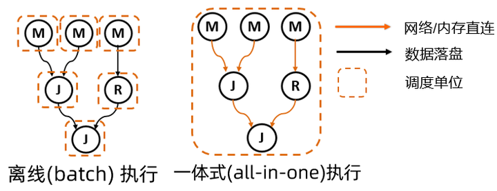 准实时作业:整个作业的所有节点都统一在一个调度单位内进行gang scheduling;节点间连接边上通过网络/内存直连传输数据,并利用数据pipeline来追求最优的性能。