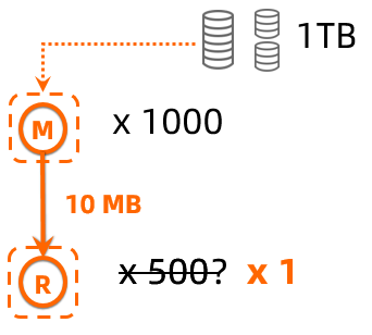 基于作业运行期间中间数据大小进行动态并发度调整,是DAG动态调整中最基本的能力。以传统MR作业为例,对于一个静态MR作业而言,能根据读取数据量来比较准确判断Mapper的并发,但是对于Reducer的并发只能简单推测,比如下图中对于处理1TB的MR作业而言,提交作业时,只能根据Mapper 1000并发,来猜测给出500的Reducer并发度,而如果数据在Mapper经过大量过滤导致最终之产出10MB中间数据时,500并发度Redcuer显然是非常浪费的,动态的DAG必须能够根据实际的Mapper产出来进行Reducer并发调整(500->1)。