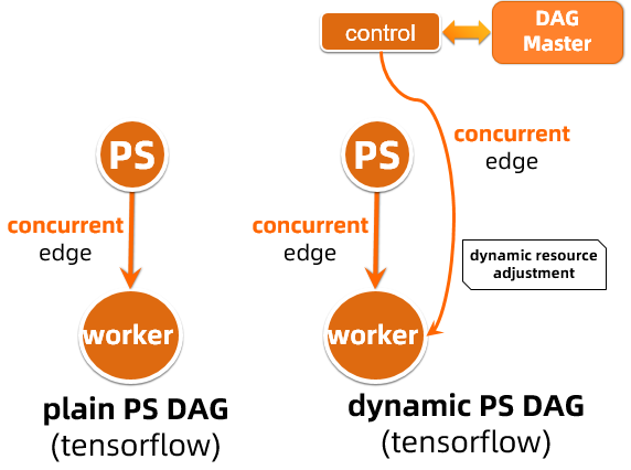 在DAG 2.0的框架上,为了更准确的描述节点之间的调度和运行关系,引入并且实现了concurrent edge的概念:通过concurrent edge连接的上下游节点,在调度上存在先后,但是可以同时运行。而调度的时机也可以灵活配置:可以上下游同步调度,也可以在上游运行到一定程度后,通过事件来触发下游的调度。在这种灵活的描述能力上,PS作业可以通过如下这种DAG来描述,这不仅使得作业节点间的关系描述更加准确,而且使得AM能够理解作业的拓扑,进行更加有效的作业管理,包括在不同计算节点发生failover时不同的处理策略等。