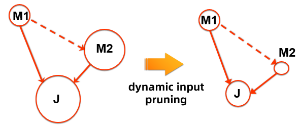 一个最直观的例子是,如果M2是一个1000个分区的分区表,并且分区的key和join的key相同,那么可以只读取M2能和M1输出join上的有效数据的partition进行读取处理。假如M1的输出只包含了M2原表数据的3个partition keys, 那么在M2就只需要调度3个计算节点来处理这3个分区的数据。也就是说M2的并发度从默认的1000,可以降低到3,这在保证同样的逻辑计算等效性与正确性的前提下,能大大降低计算资源的消耗,并数倍加速作业的运行。这里的优化来自与几个方面: