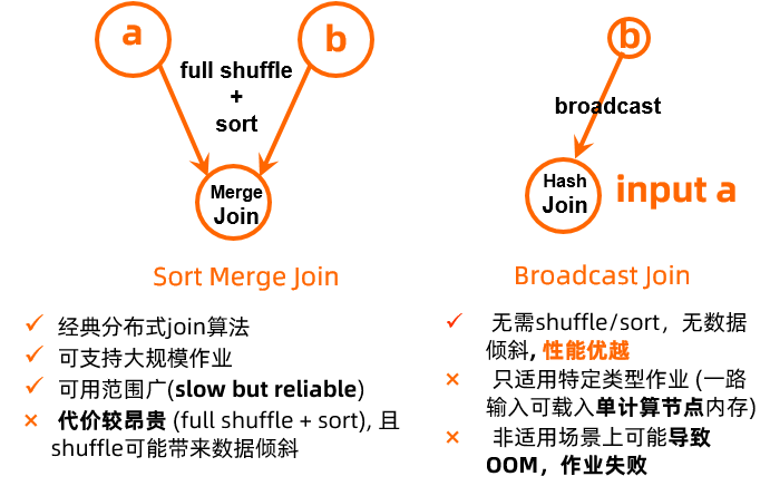 分布式SQL中,map join是一个比较常见的优化,其实现原理是在join的两个表中,如果有一个超小的表(可以 fit 到单个计算节点的内存中),那对于这个超小表可以不做shuffle,而是直接将其全量数据broadcast到每个处理大表的分布式计算节点上。通过在内存中直接建立hash表,完成join操作。map join优化能大量减少 (大表) shuffle和排序,非常明显的提升作业运行性能。但是其局限性也同样显著:如果"超小表"实际不小,无法fit进单机内存,那么在试图建立内存中的hash表时就会因为OOM而导致整个分布式作业的失败,而需要重跑。所以虽然map join在正确使用时,可以带来较大的性能提升,但实际上优化器在产生map join的plan时需要偏保守,很多情况下需要用户显式的提供map join hint来产生这种优化。此外不管是用户还是优化器的选择,对于非源表的输入都无法做很好的判断,因为中间数据的大小往往需要在作业运行过程中才能准确得知。