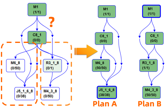 而map join与默认join方式(sorted merge join)对应的其实是两种不同优化器执行计划,在DAG层面,其对应的是两种不同的逻辑图。要支持这种运行过程中根据中间数据特性的动态优化,就需要DAG框架具备动态逻辑图的执行能力,这也是在DAG 2.0上开发的conditional join功能。如同下图展示,在对于join使用的算法无法被事先确定的时候,允许优化器提供一个conditional DAG,这样的DAG同时包括使用两种不同join的方式对应的不同执行计划支路。在实际执行时,AM根据上游产出数据量,动态选择一条支路执行(plan A or plan B)。这样子的动态逻辑图执行流程,能够保证每次作业运行时都能根据实际作业数据特性,选择最优的执行计划。