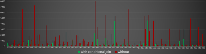conditional join是动态逻辑图的第一个落地场景,在线上选择一批适用性作业,动态的conditional join相比静态的执行计划,整体获得了将近3X的性能提升。