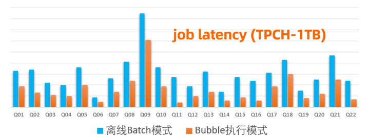 在标准TPCH 1TB全量测试中,混合bubble模式体现出了相比离线和准实时的一体化模式(gang scheduling)更好的资源/性能 tradeoff。选用Greedy Bubble(size = 500)的策略,bubble相比离线作业性能提升了2X(资源消耗仅增加17%,具体数值略)。同时与一体化调度的准实时作业比较,bubble执行在只消耗了40%不到的资源(cpu * time) 的前提下,其性能达到了准实时作业的85%(具体数值略)。可以看到,这种新型的bubble执行模式,允许我们在实际应用中获取很好的性能与资源的平衡,达到系统资源有效的利用。Bubble执行模式目前正在阿里集团内部全量上线中,我们在实际线上的作业也看到了与TPCH测试非常相似的效果。